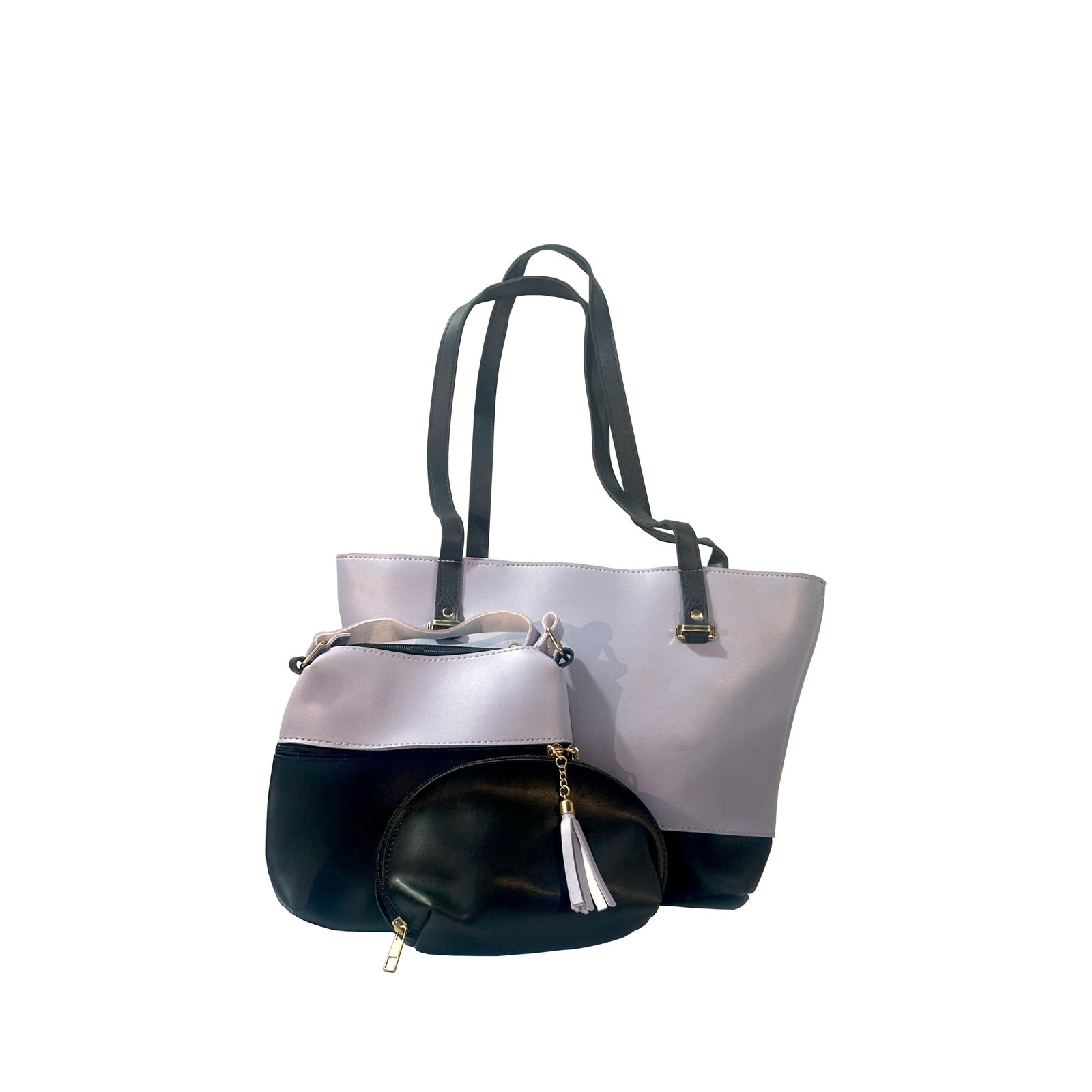 The DREAM SET is a sophisticated three-piece collection that offers versatility and coordinated style for any occasion. This set combines a roomy, structured tote, a compact cross-body bag, and a matching half-moon pouch, ensuring you have the perfect accessory for every need. The design features elegant color-blocking and playful tassel accents, making it a functional and beautiful addition to your wardrobe.